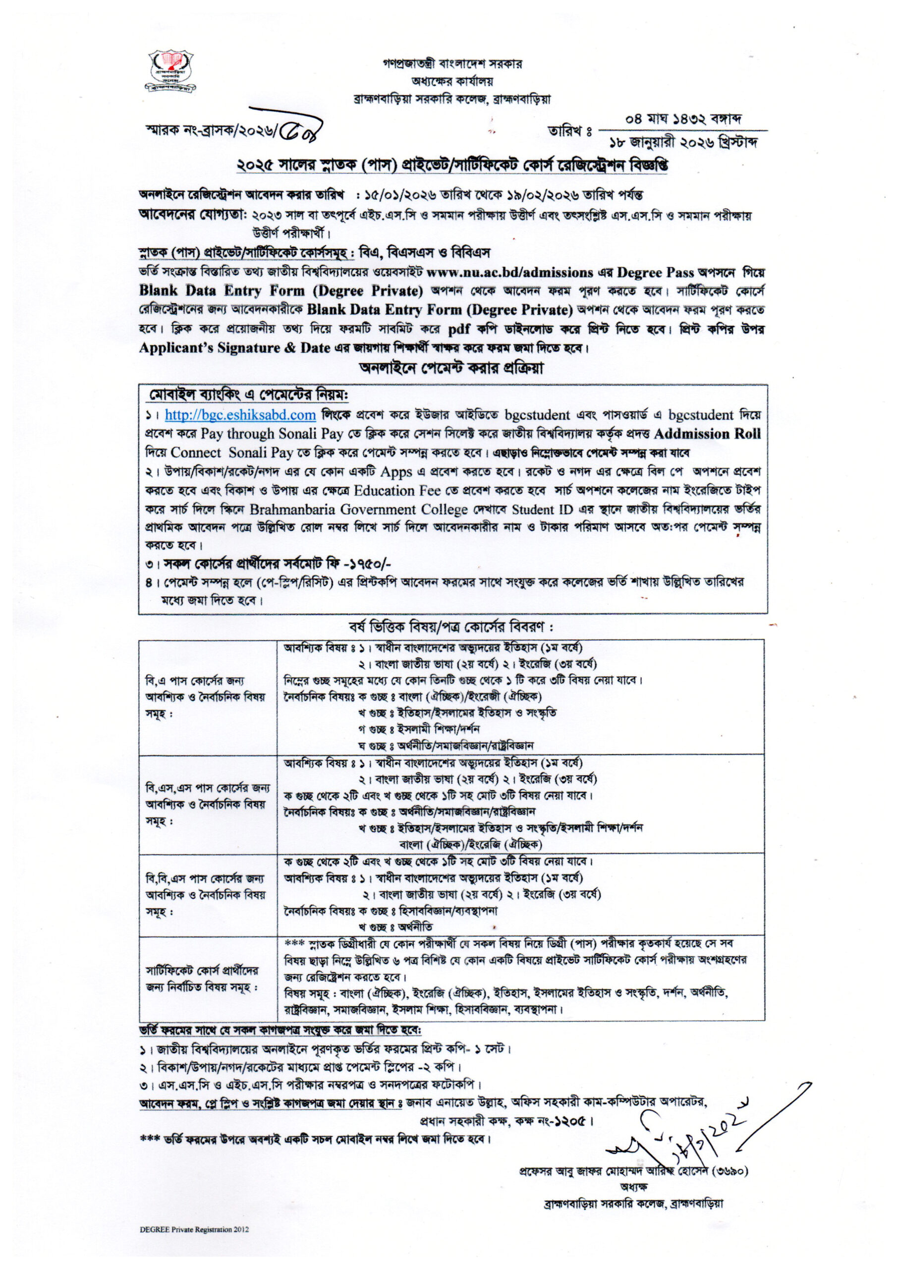 | ২০২৫ সালের স্নাতক (পাস) প্রাইভেট/সার্টিফিকেট কোর্সে রেজিস্ট্রেশন সংক্রান্ত বিজ্ঞপ্তি | ১৮-০১-২০২৬ | ডাউনলোড |